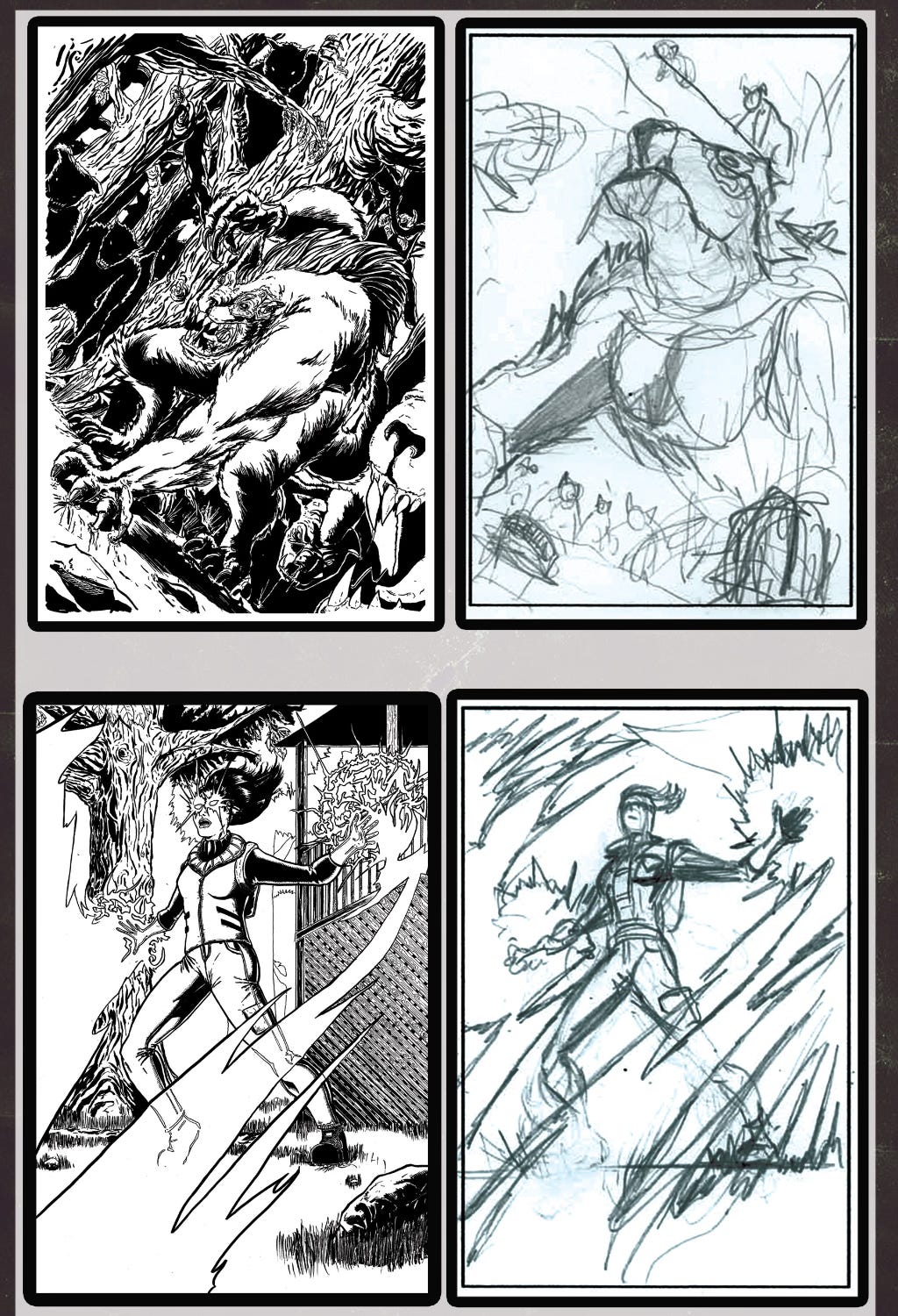 In this earliest visual stage, a comic artist begins to loosely define the panel composition and page layout. Some might develop roughs or thumbnails of panels individually, or tackle them all at once as full page layouts. In any event, top of mind considerations include: clarity, storytelling flow (ie - capturing and directing the reader’s attention and guiding their eye), dynamism, and the all-important ‘does this look cool?’ factor.