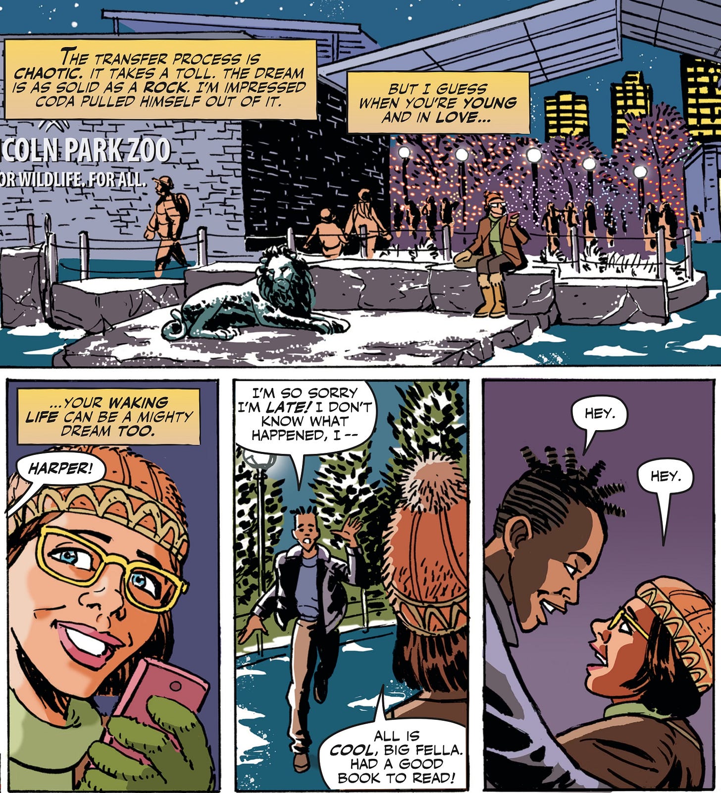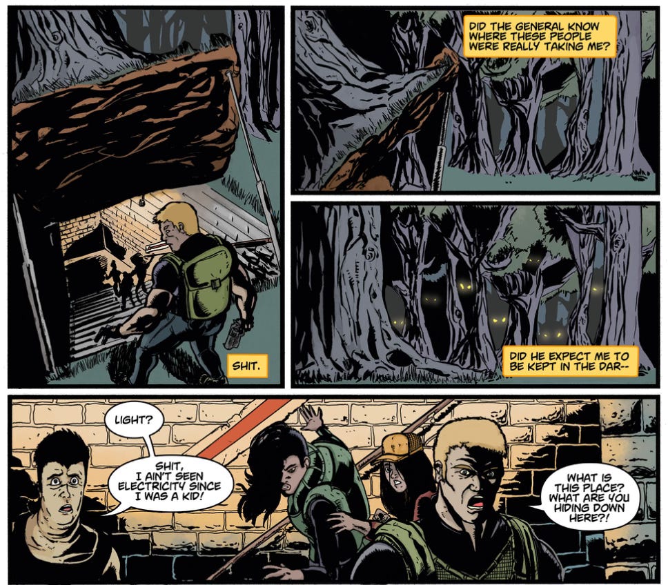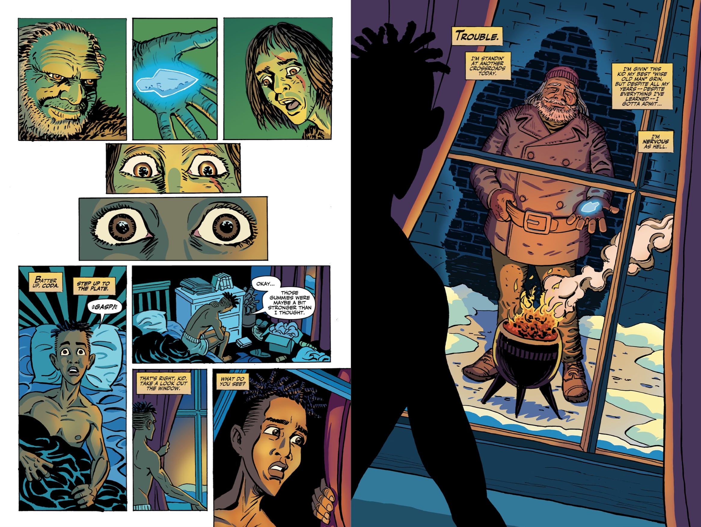 This one is also true for any storytelling, but it’s that much MORE vital for comics, where we need to get to what’s visually interesting stat. In Big Shoulders one of our characters (Coda) is approached by an immortal and given a mission that holds the weight of the ages. Rather than watching Coda get ready for bed, brush his teeth and read a book before dozing off, we cut right to this fateful meeting.