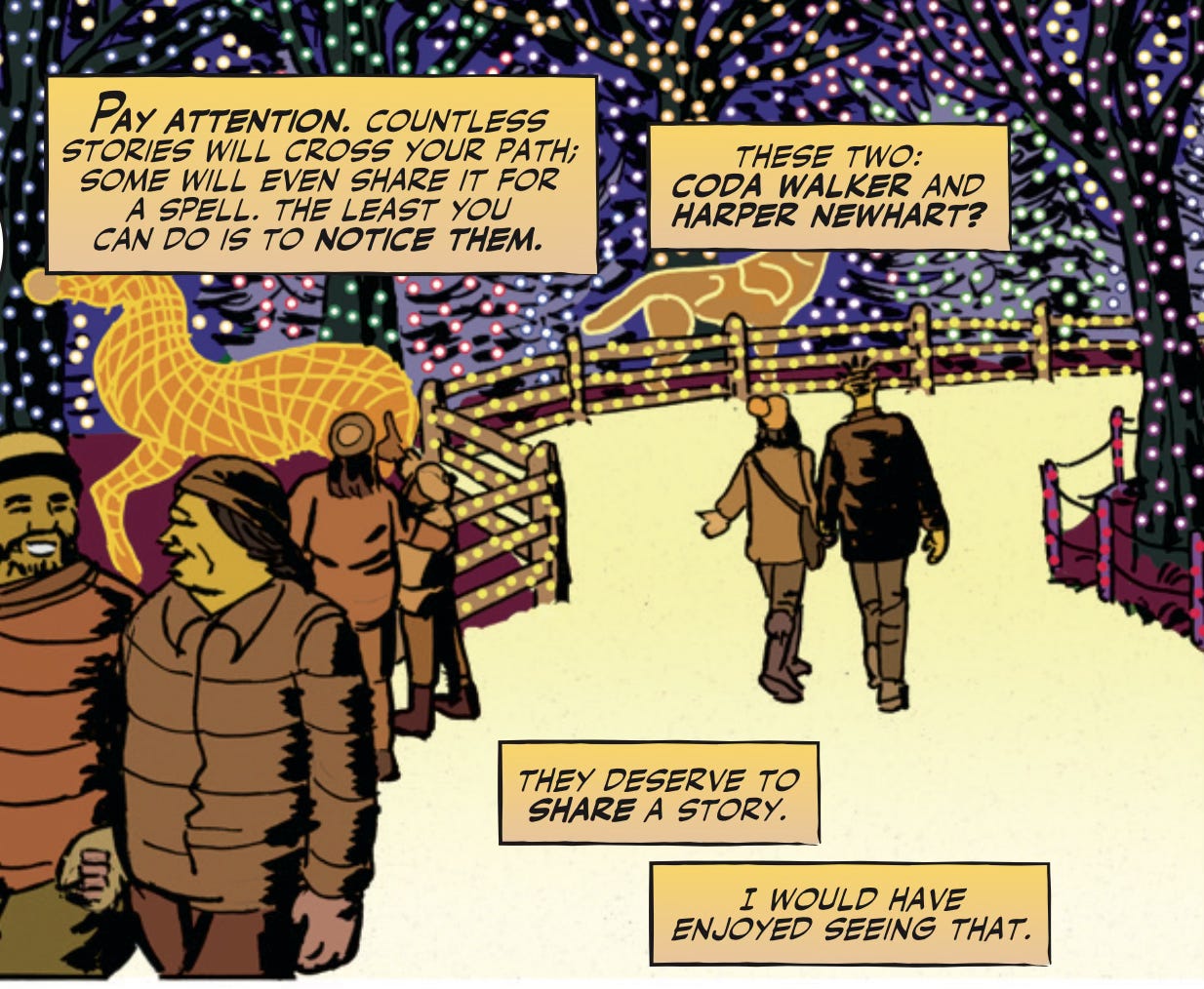 Here’s an example that was created in part from considering this very question. It’s from Big Shoulders #1. The scene features two young love birds who are desperate to remain together… and narration from a third party that suggests doom.