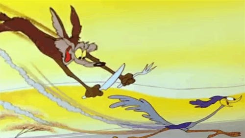 We’d all be thrilled for Wilie if he ever had a moment’s satisfaction. But this would also kill the thrust of this entire storytelling world, which were, in fact, quite rigidly defined and adhered to by creator Chuck Jones (link). Like a fine tuned machine, these Looney Tune shorts are a master class in needs never getting met. Period. Meanwhile, that dang bird is the ultimate villain in large part because he always gets his meal. Only a villain gets what they want, and the Road Runner? The ultimate baddie.